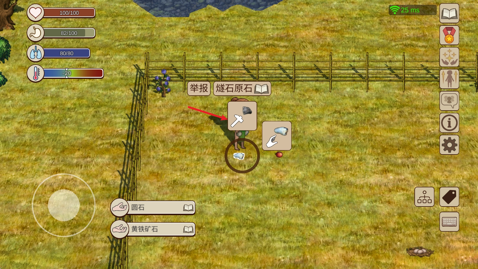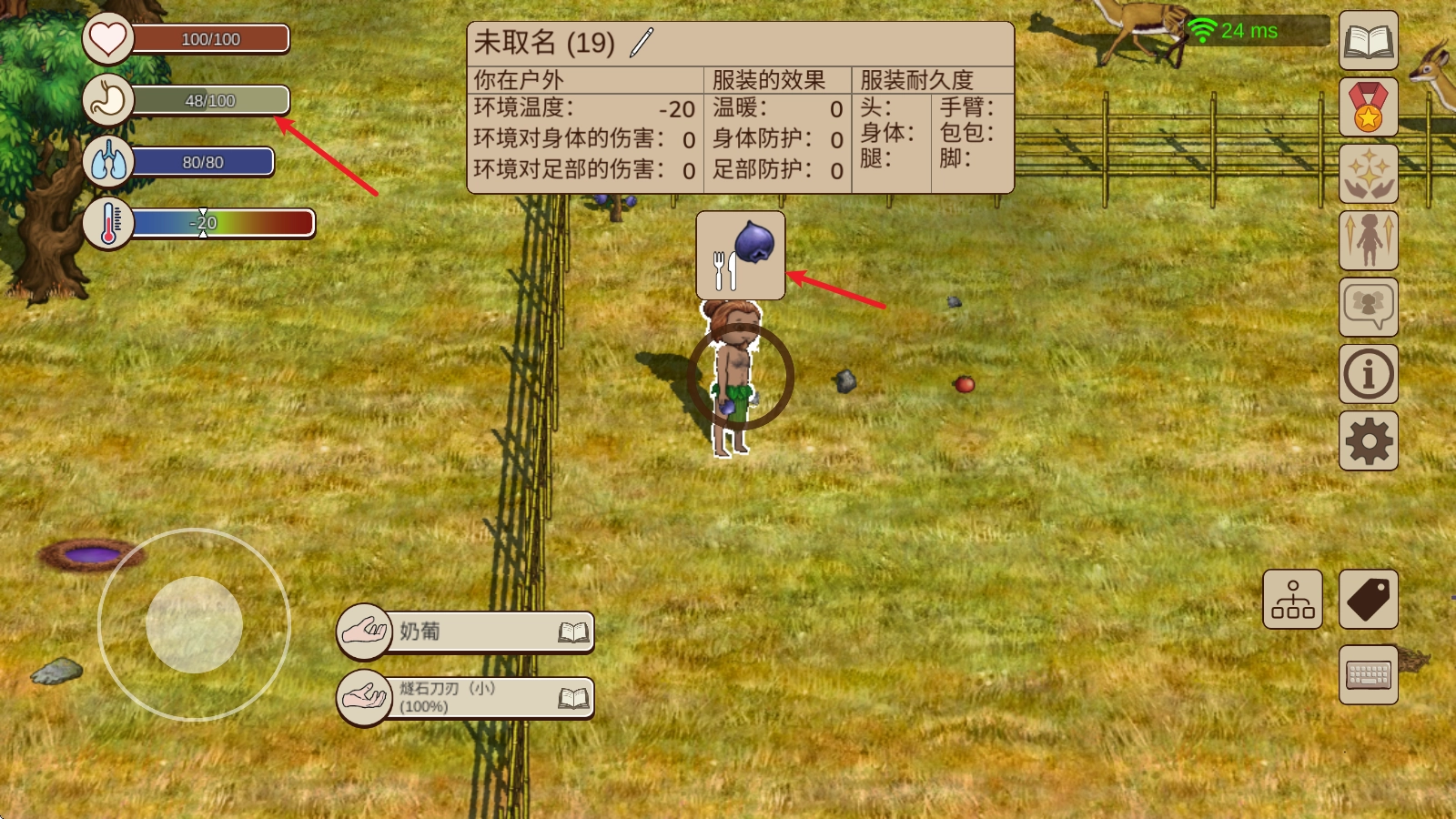 3、点击人物就能吃掉手中的食物,增加自身的饥饿值。