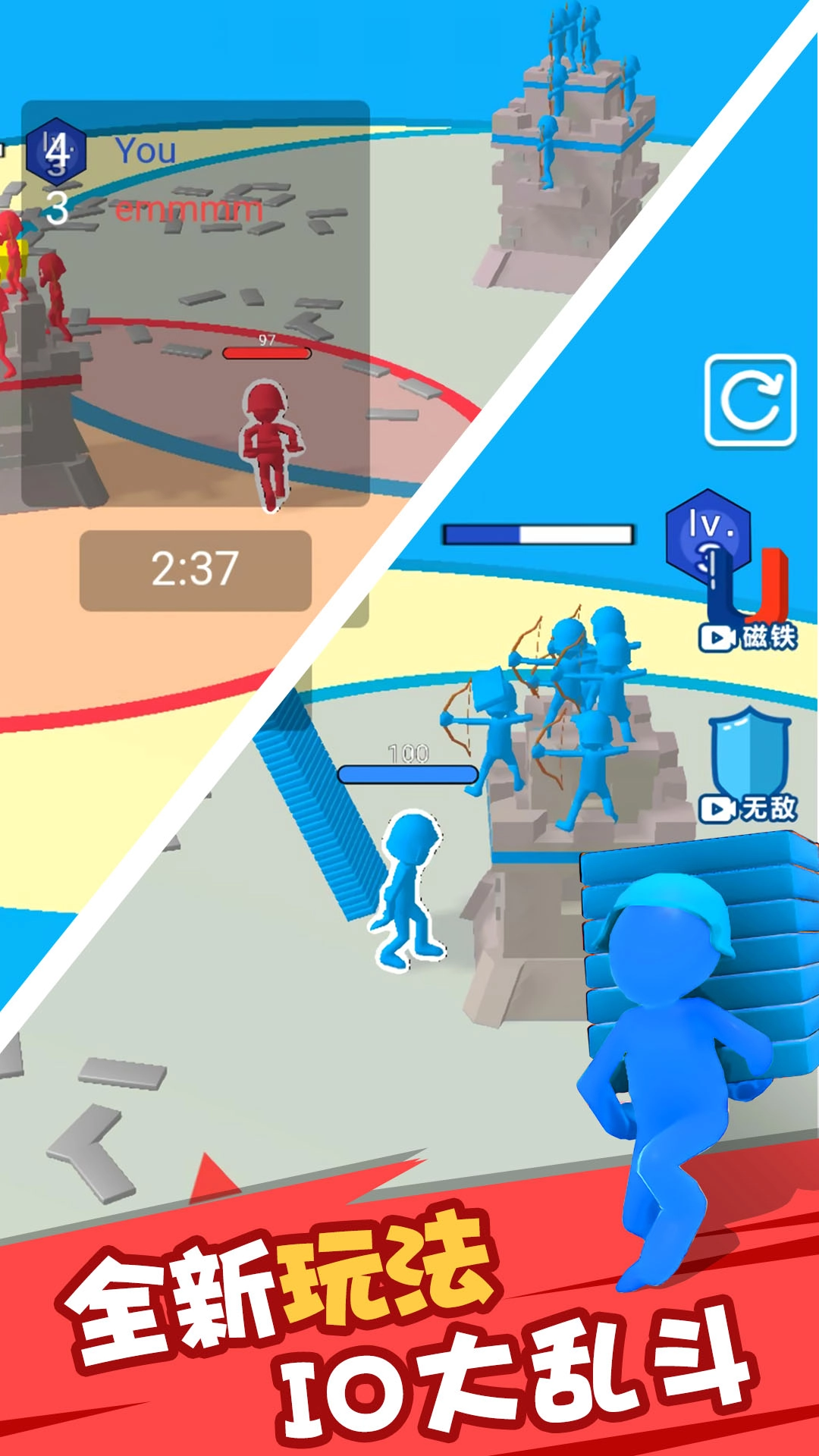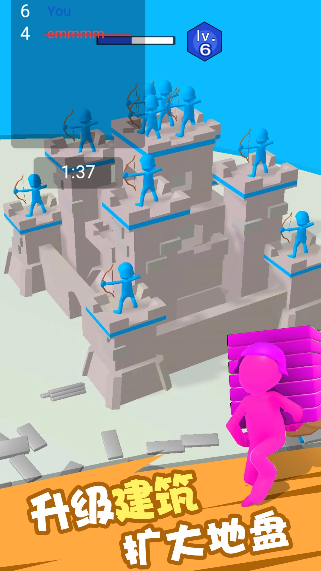 玩家控制人物在地图上不断的收集砖块来升级的自己的城堡,应对危机。