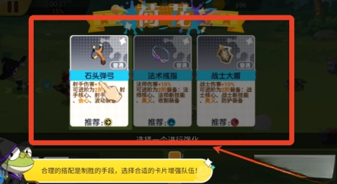1、拥有丰富的青蛙和精灵卡牌收集系统,每张卡牌都有独特的技能效果。玩家需根据关卡特点灵活调整卡组,制定合适的策略。