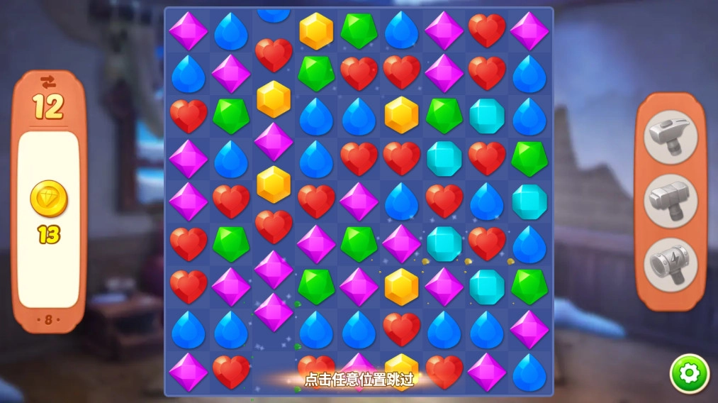 1、进入游戏后,直接消除三颗相同颜色的宝石,力求快速通关。