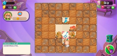 1、运用魔法合并各种美味菜肴和工具,创造出强大的魔法物品,获取重建房屋所需的资源。