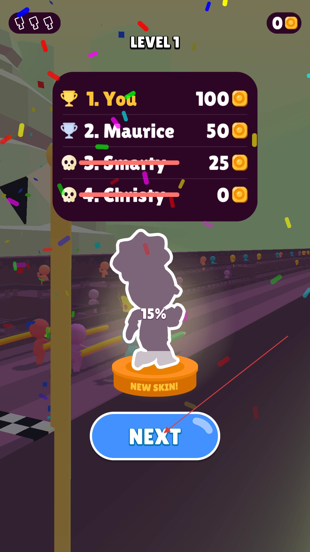 3、成功完成关卡后,可查看排名和奖励,可通过积累金币解锁【NEWSKIN】,点击【NEXT】进入下一关继续挑战。