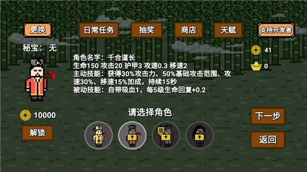 道士先生手机版呈现像素风格的肉鸽Roguelike玩法,玩家将化身身着黄色道袍、手握桃木剑的道士,于遍布僵尸的丛林里艰难求生,体验道士先生的冒险历程。