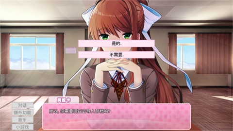 莫妮卡MAS手机版是以《DokiDoki Literature Club!》为蓝本创作的恋爱模拟同人游戏,主角为莫妮卡。游戏中,玩家将与莫妮卡相遇相知,开启一段温馨甜蜜的恋爱旅程。该作融入了全新的剧情架构与挑战关卡,同时提供对话交流、音乐欣赏、趣味小游戏等多元互动形式。借助新增的对话系统,玩家能和莫妮卡探讨电子游戏、哲学思辨等各类话题,还可以一起打乒乓球、聆听音乐。