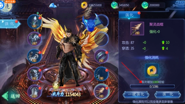 3、点击强化/一键强化对装备进行强化