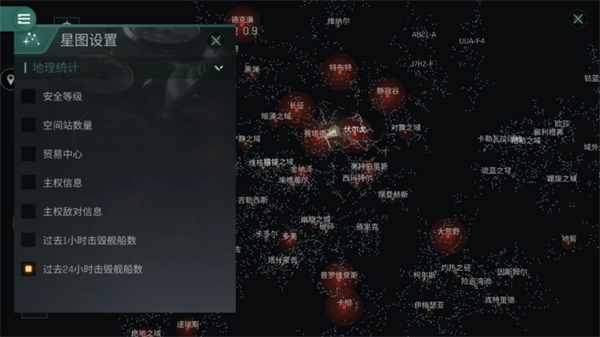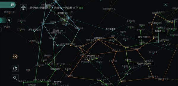点击该数字或地区名,即可快速打开星图。在星图界面中,我们既能通过点击左下角的放大镜图标搜索特定地区,也能点击饼状图图标切换星图的显示模式,进而查看星系的主权归属信息或PVP危险区域。