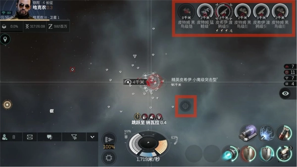在总览界面关闭的情况下,右上角一列为附近舰船的预览图标,只会显示离你最近的6艘舰船。在PVE的时候,屏幕中间偏右下会出现一键锁定的按钮,但PVP的话就要自己手动锁定了。