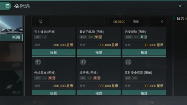 EVE际遇玩法简单点来讲其实就是一个任务大厅,我们可以从里面选取自己所想要接取的任务,只要在指定的时间完成任务我们就可以得到相应的奖励报酬,这些任务无外乎可以分为两大类,一类是非战斗类,包括运输、调查和采矿。另一个则是战斗类,与普通的异常空间相类似(故事书任务除外)。