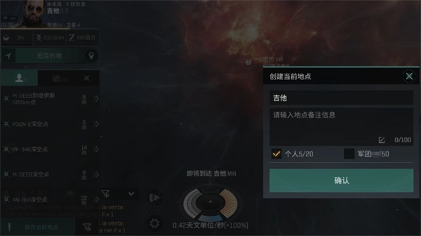 导航下面是我们手动保存的地点,就比如老玩家们经常说的“深空点”,就是在两个星门之间的跃迁过程中,点击保存地点,就可以得到了。因为以这种方式保存下来的地点安全系数非常高,所以大部分接触过PVP玩家都会将这些地点作为自己的撤退路线。