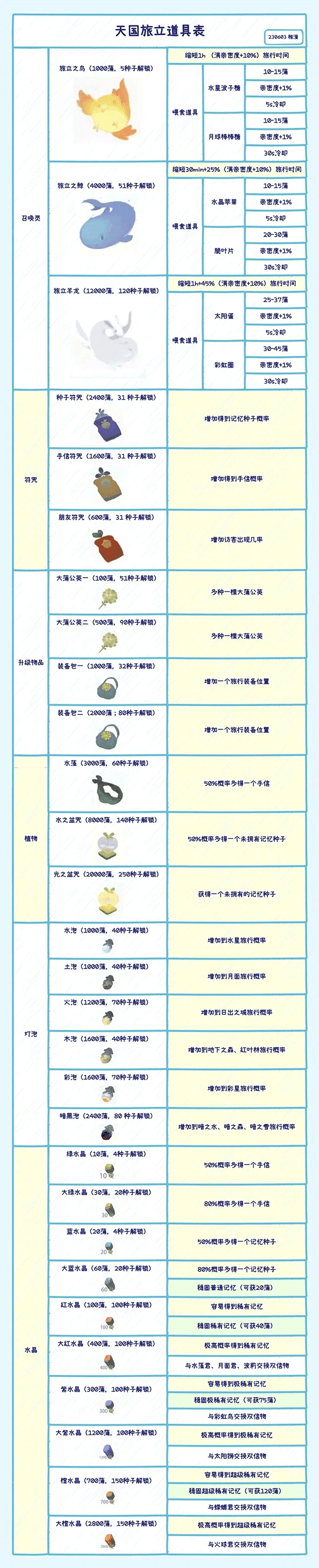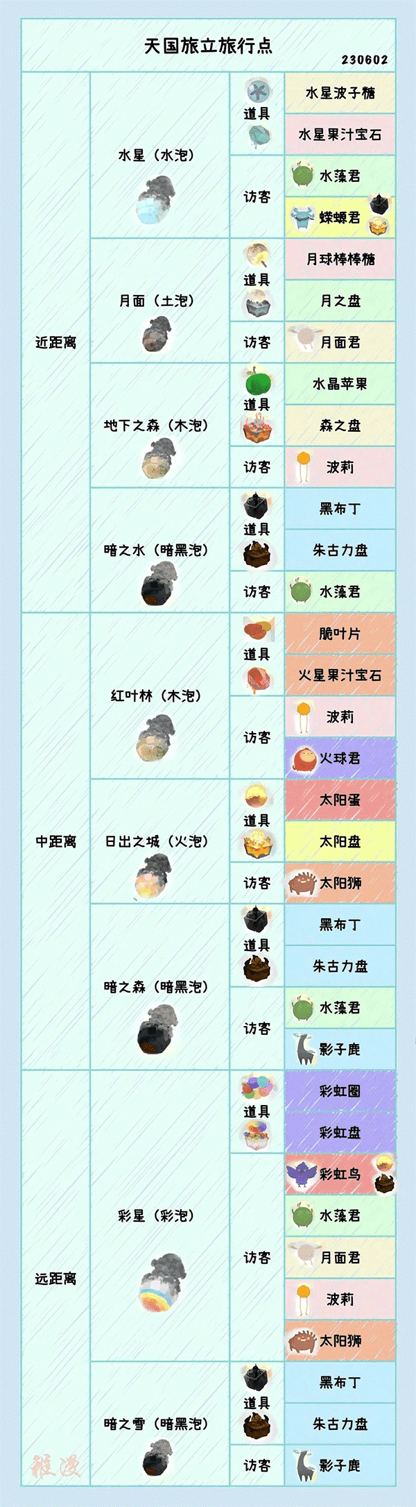 可以和访客交换的道具,已经用相同颜色标注出来了,蝾螈君和彩虹鸟则单独列出来说明。