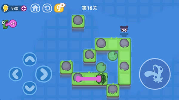 2、移动到上面这片荷叶,拉动2号舌头,接着继续拉动3号石头。