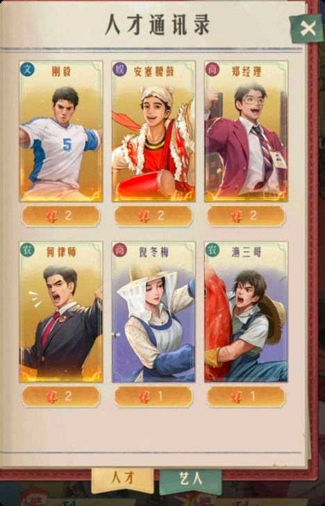 在游戏里,人才与艺人会被划分成农、商、文、娱这四种职业类别。那么我们该如何获取人才,又应当优先获取并培养哪一位人才呢?