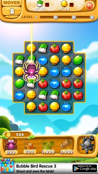 5、游戏设有多种道具,如 Bomb 可清除一片作物,彩虹锤可快速匹配关键作物等。