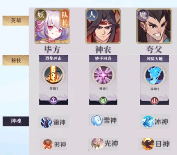 1、阵容搭配: 毕方(队长)+ 神农 + 夸父