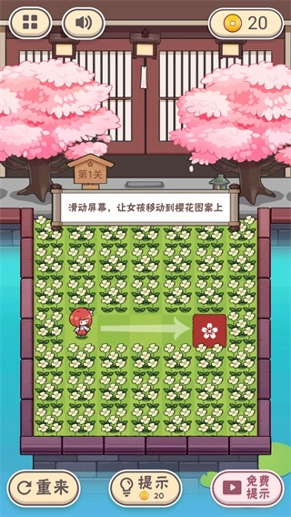 3、只要滑动屏幕,让女孩移动到樱花图案的位置,就能成功闯关。