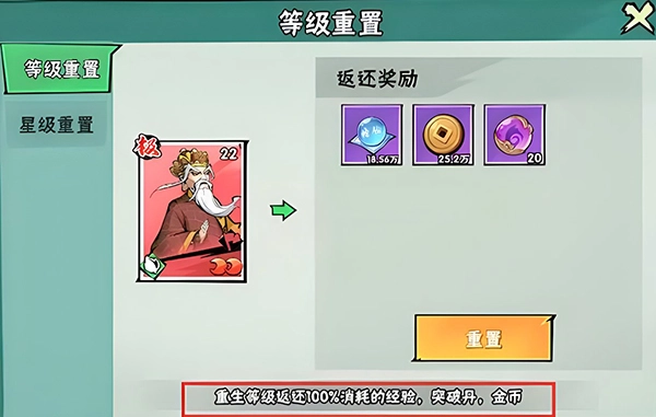 1、当少侠抽到更心仪的侠客后,可对之前投入过资源的侠客进行重置操作。重置包含等级重置与星级重置两种类型,这一机制有效规避了前期侠客培养资源的浪费问题。其中,等级重生会100%返还培养过程中消耗的经验、突破丹和金币,完全没有资源损耗哦!